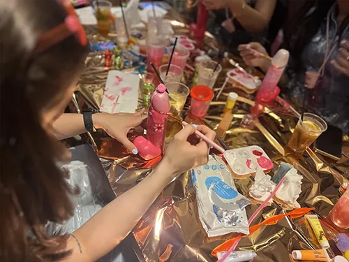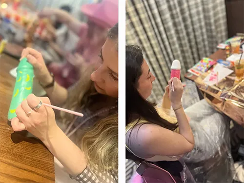 Each guest gets a ceramic piece to decorate, plus paints, brushes, glitter, feathers, jewels and all the fun extras. A friendly instructor guides the session from start to finish.
